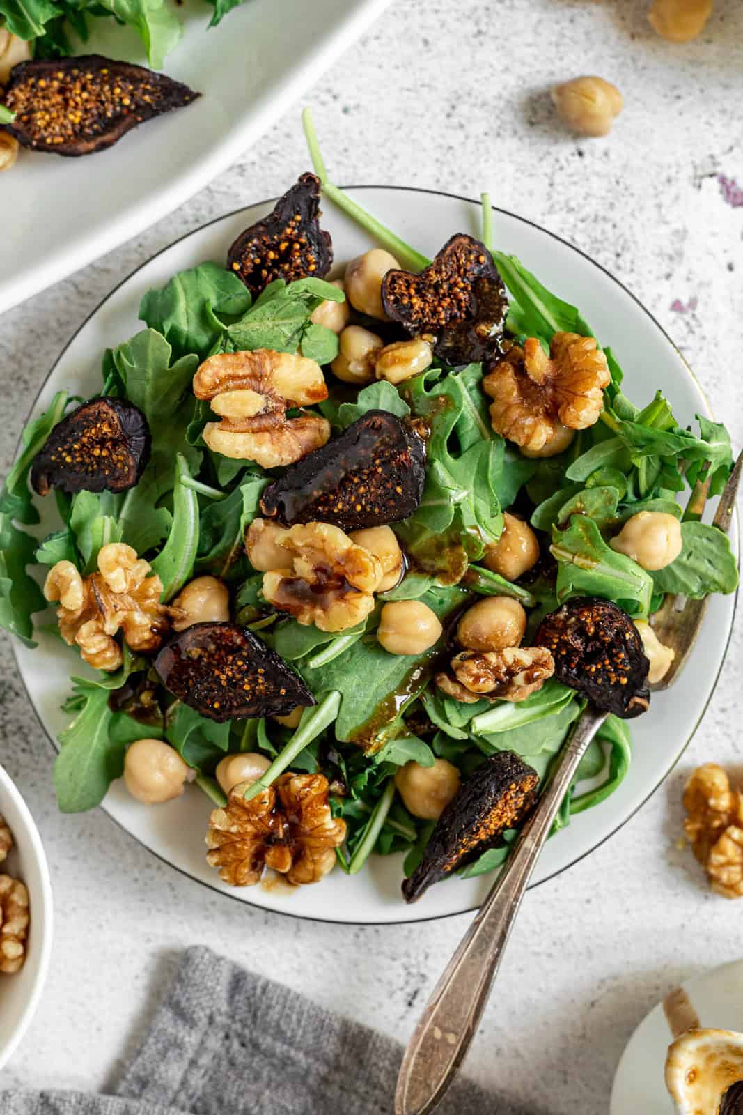 - Arrange the arugula, chickpeas, figs, and walnuts on a platter. Drizzle with the balsamic dressing. Enjoy!
