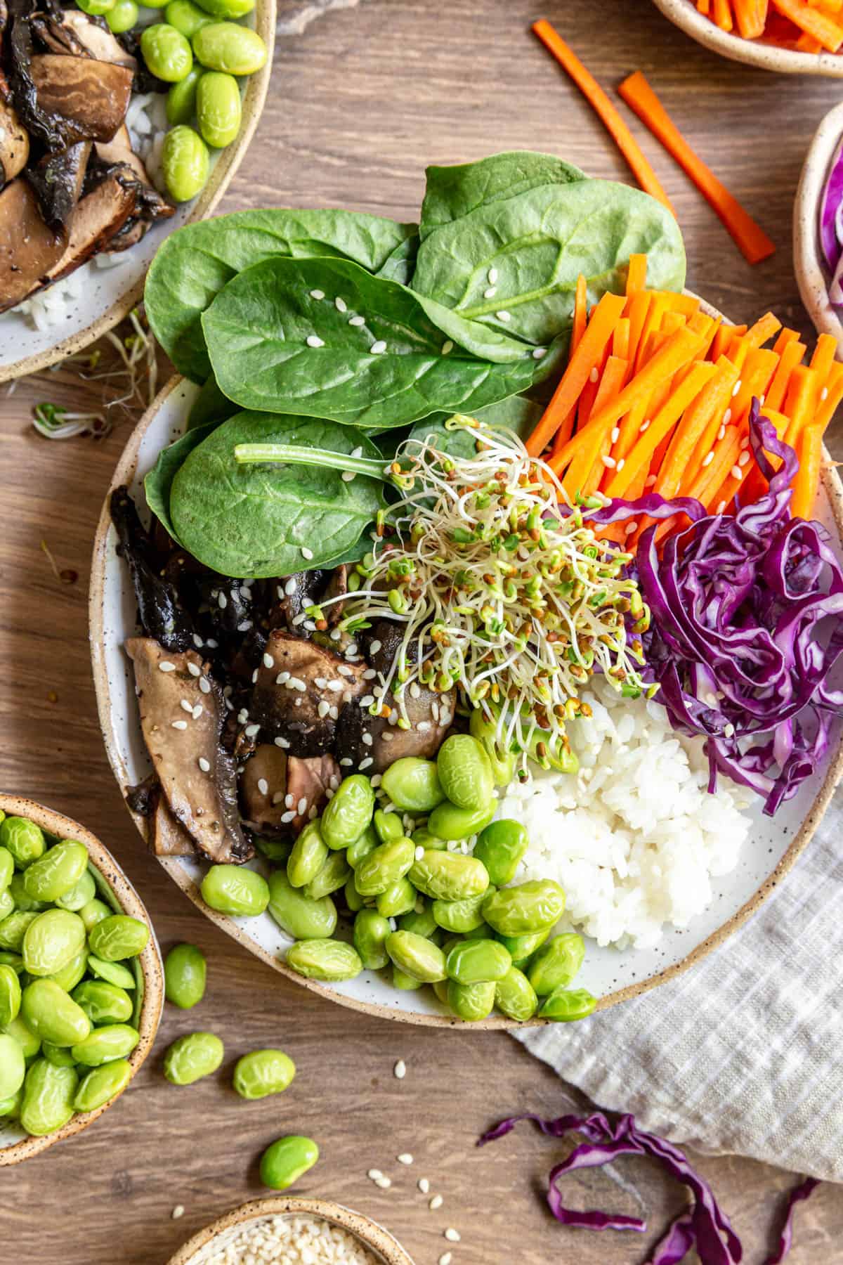 - Veggie-full - in addition to the mushrooms, I've suggested adding carrots, spinach, cabbage, and microgreens. But the veggie possibilities are endless. These bowls would also taste great with some red onion and cucumbers. Or whatever veggies you love!
