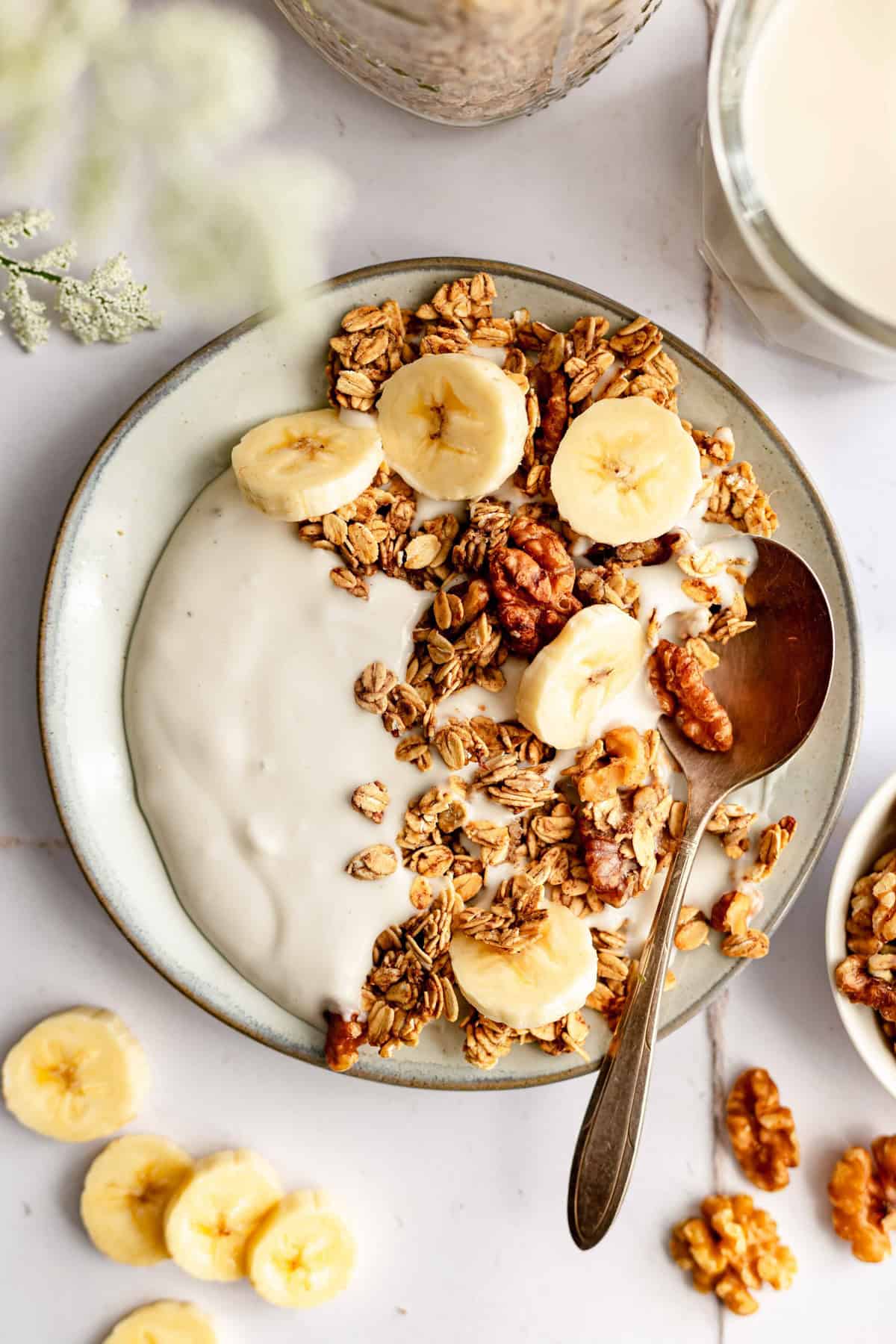 Banana Walnut Granola is a deliciously simple recipe, made with only 3 ingredients. This banana sweetened granola is tasty, healthy, and completely whole-food plant-based!
