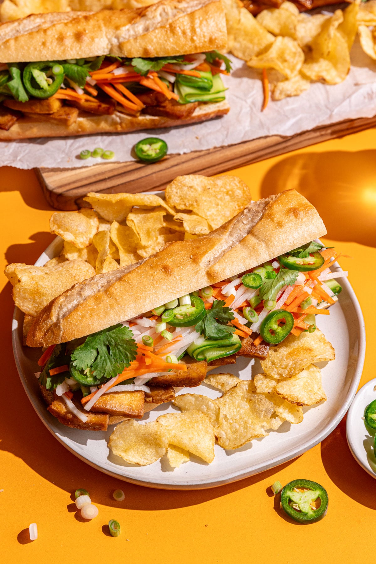 - Assemble the sandwiches. Spread the sriracha mayo on the bottom of the baguette. Add the tofu, cucumber, pickled veggies, jalapeños, scallions, and cilantro.