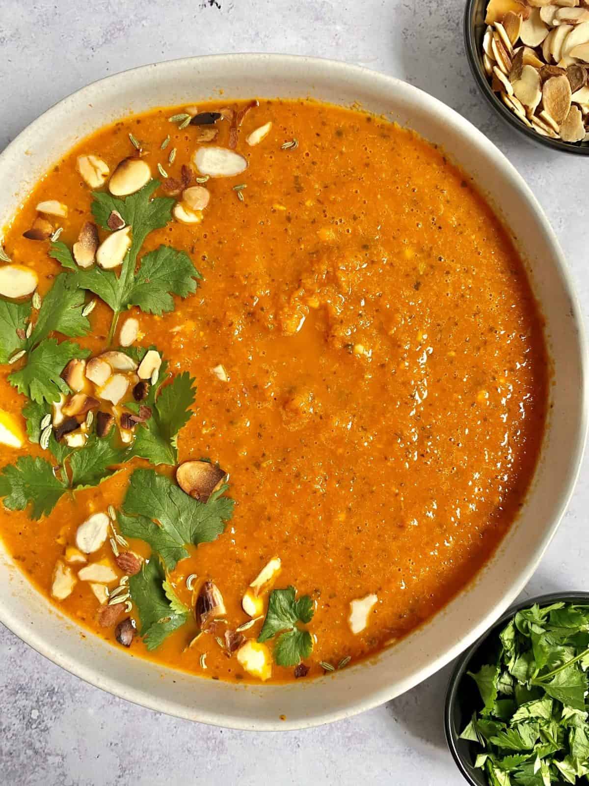 - Serve the soup topped with cilantro and the toasted almonds. Enjoy!