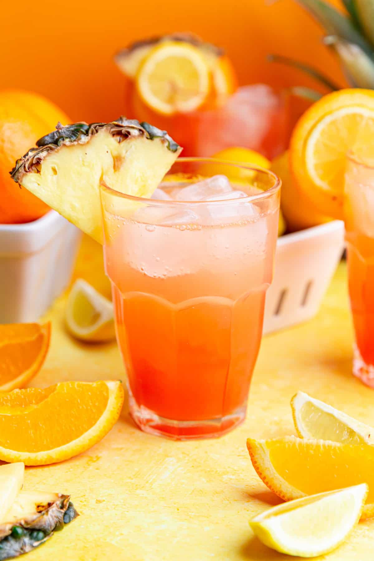 - Garnish with lemon, orange, and pineapple wedges.