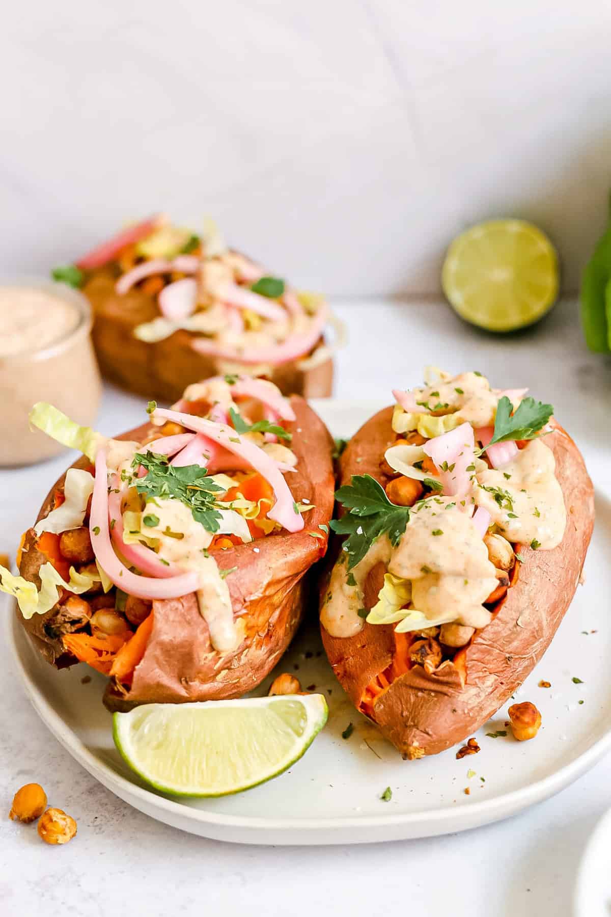 Crispy Chickpea Stuffed Sweet Potatoes are a delicious mix of textures - crunchy chickpeas, soft sweet potato, and a creamy dressing.