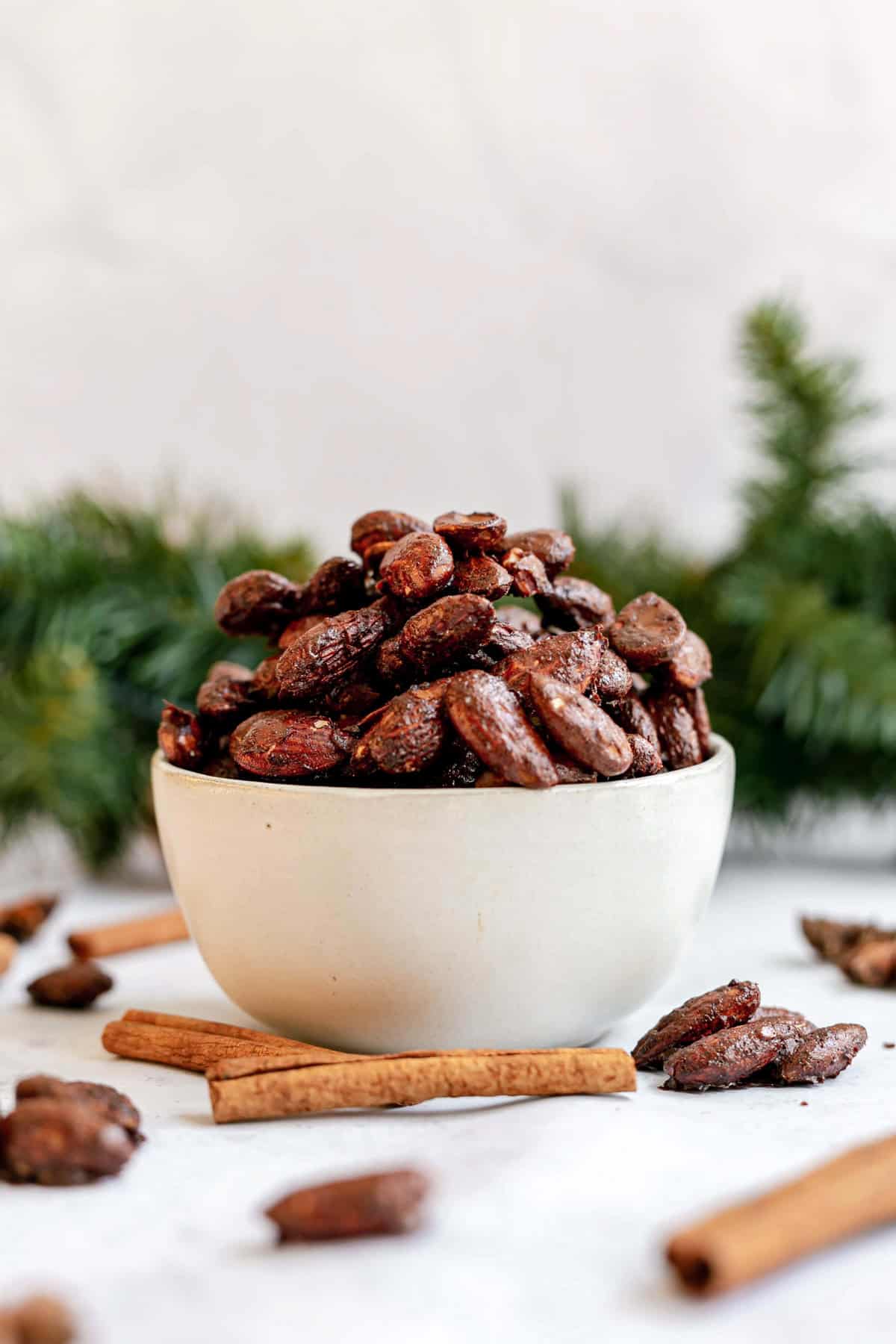 Covered in sticky molasses and sprinkled with gingerbread spices, these Gingerbread Almonds are the perfect (healthy) holiday snack.