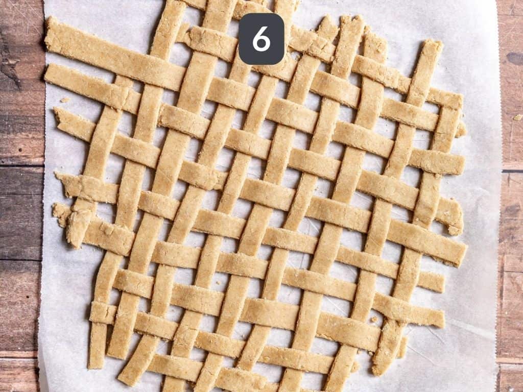 - Shape the strips into a 10"-11" lattice, with the open spaces approximately ½" apart. Press down gently on the places where the crust overlaps to seal the layers together. Set aside. *See post for detailed lattice instructions.