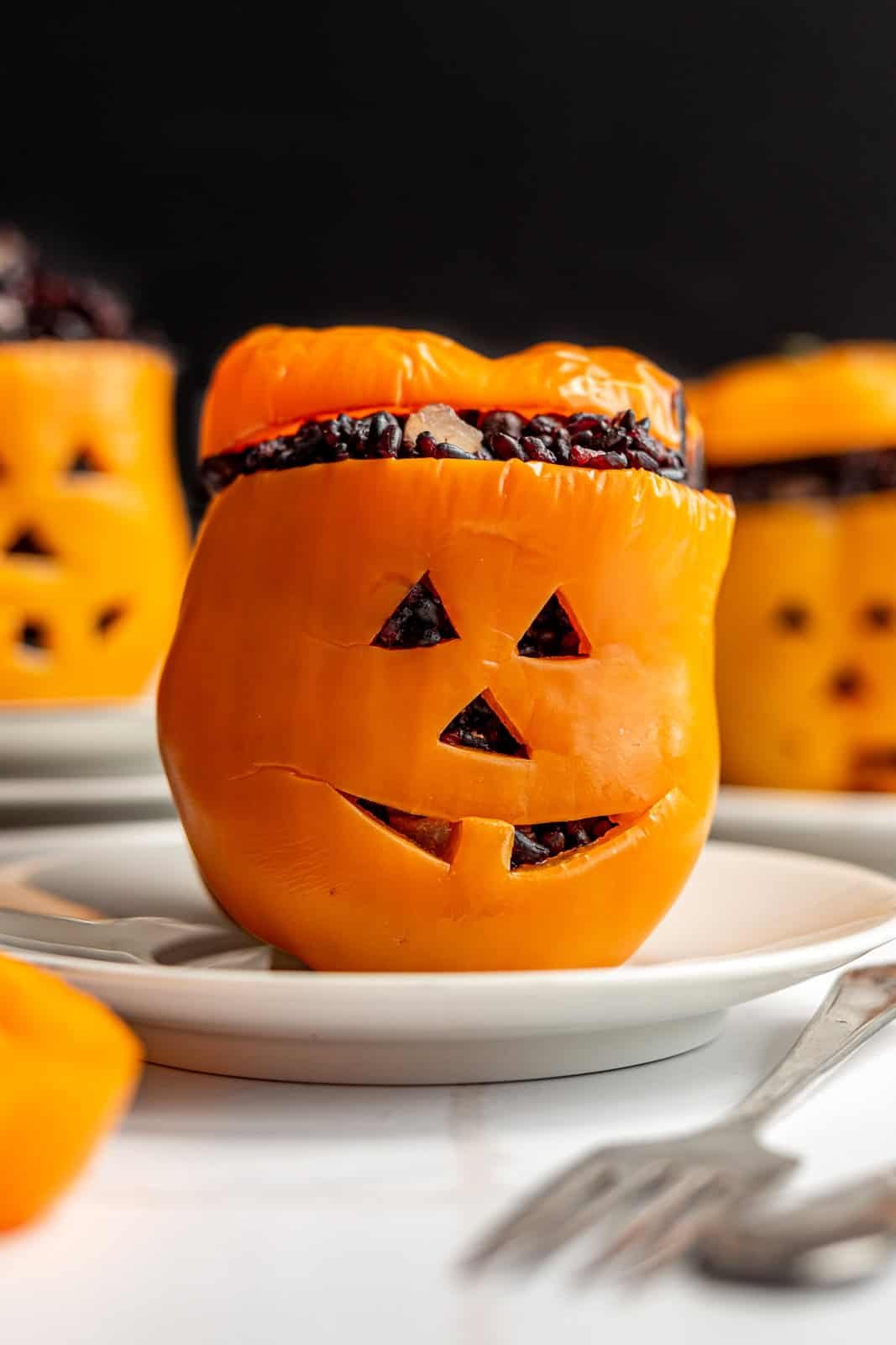 I mean, these jack-o-lanterns are so cute. I had such a fun time carving different faces into each of the peppers. And then when you stuff them with Lotus Food's Forbidden rice they really come to life like a real jack-o-lantern.