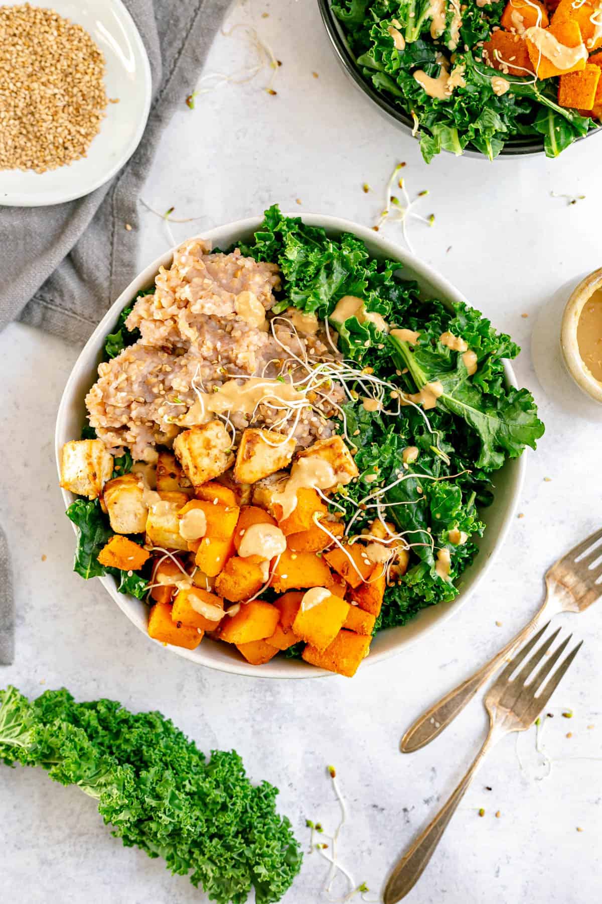 - When all the ingredients are finished cooking, assemble the bowls. Place a bed of kale in each bowl, then add a scoop of buckwheat. Top with squash and tofu. Drizzle with any leftover dressing and sprinkle with sesame seeds. Enjoy!