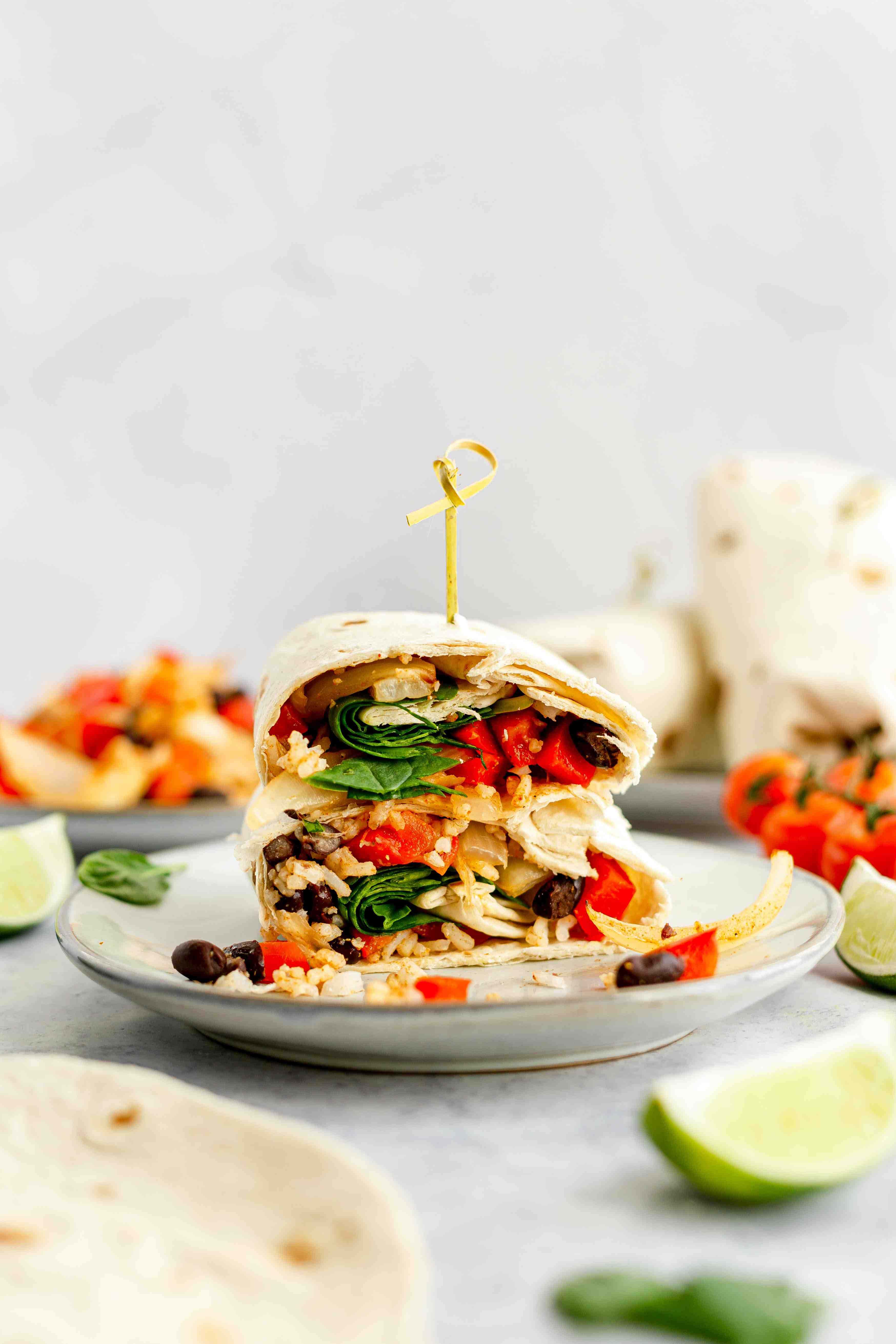 - Assemble the burritos: spoon the veggie mixture onto a tortilla, top with a handful of spinach, and any other toppings of choice, then fold the sides of the tortilla and roll into a burrito. Enjoy!