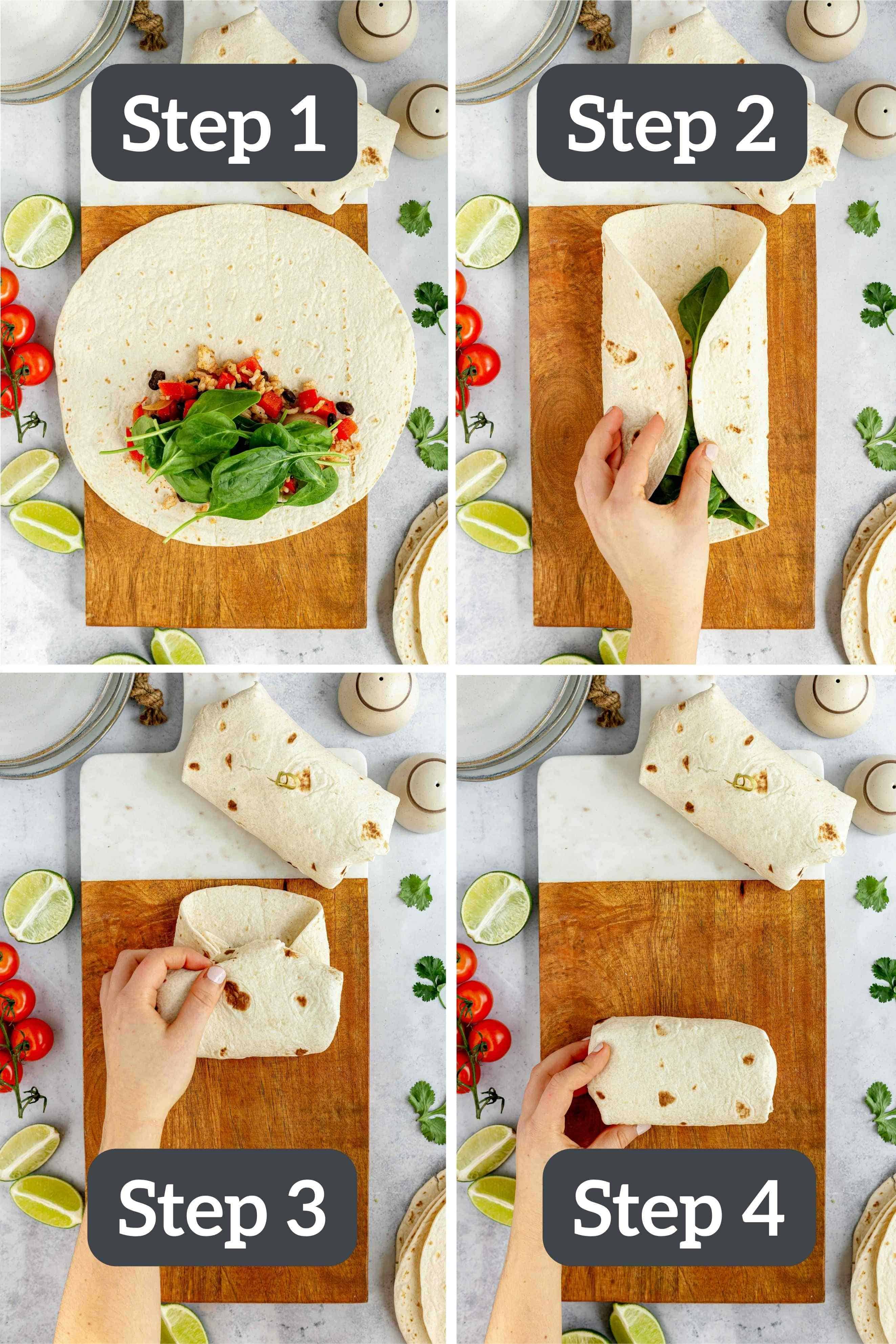 Place all the ingredients on one end of the tortilla, then fold in the edges, and roll.