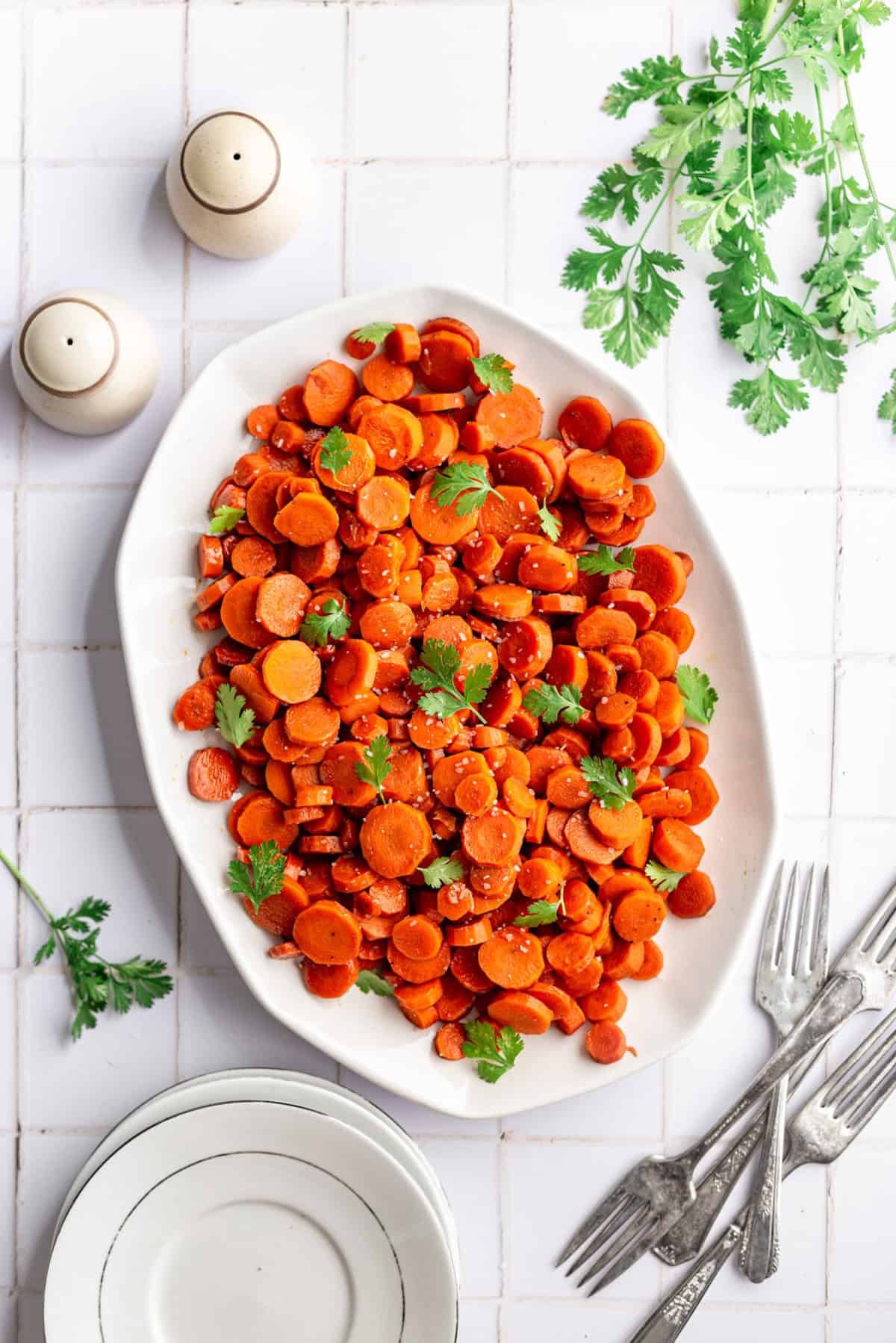 Top the cooked carrots with some cilantro to give the dish a fresh flair and you've got yourself a tasty Thanksgiving or Christmas side dish. You can easily increase or decrease the yield of this recipe to feed a crowd or to serve 1-2 people.
