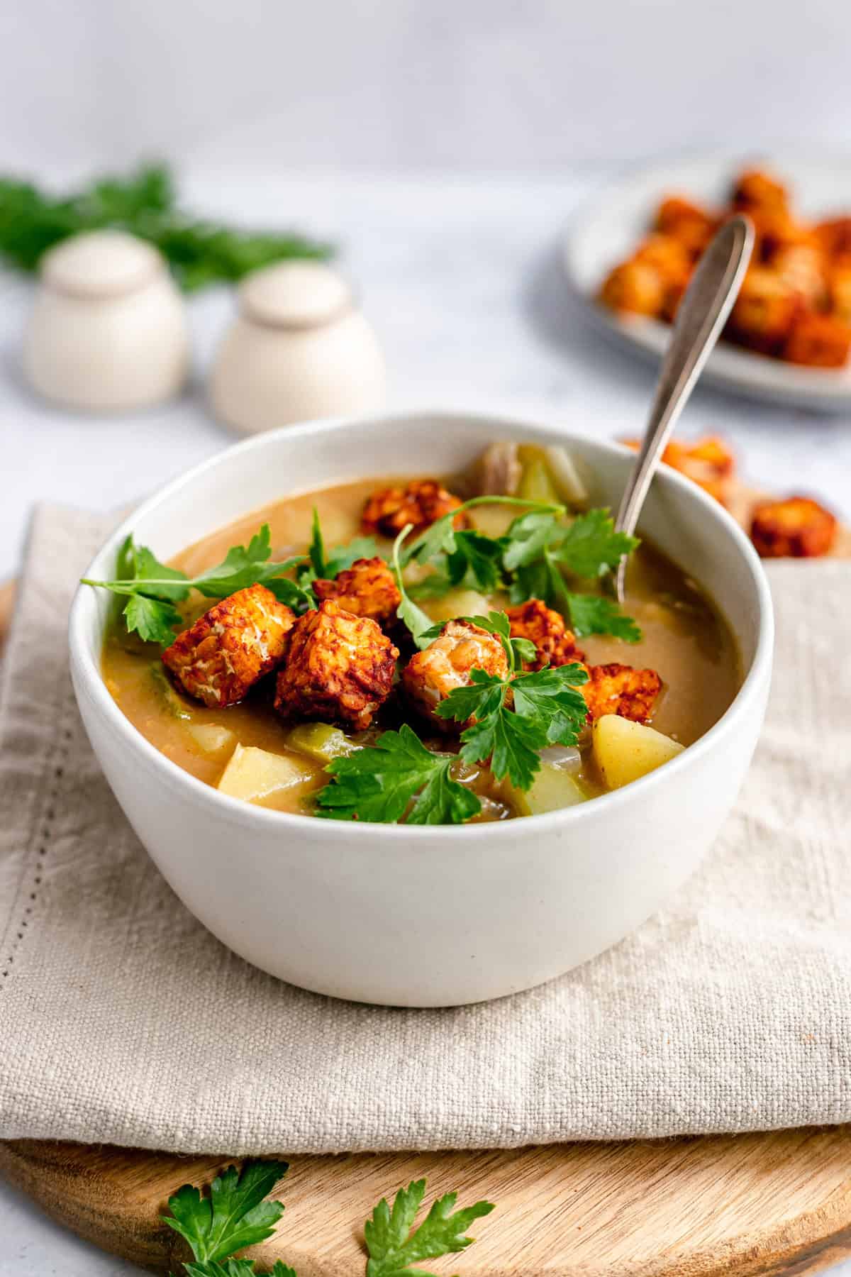 - To serve, ladle into bowls. Add your desired amount of tempeh to each bowl. Sprinkle with paprika and additional parsley. Enjoy!