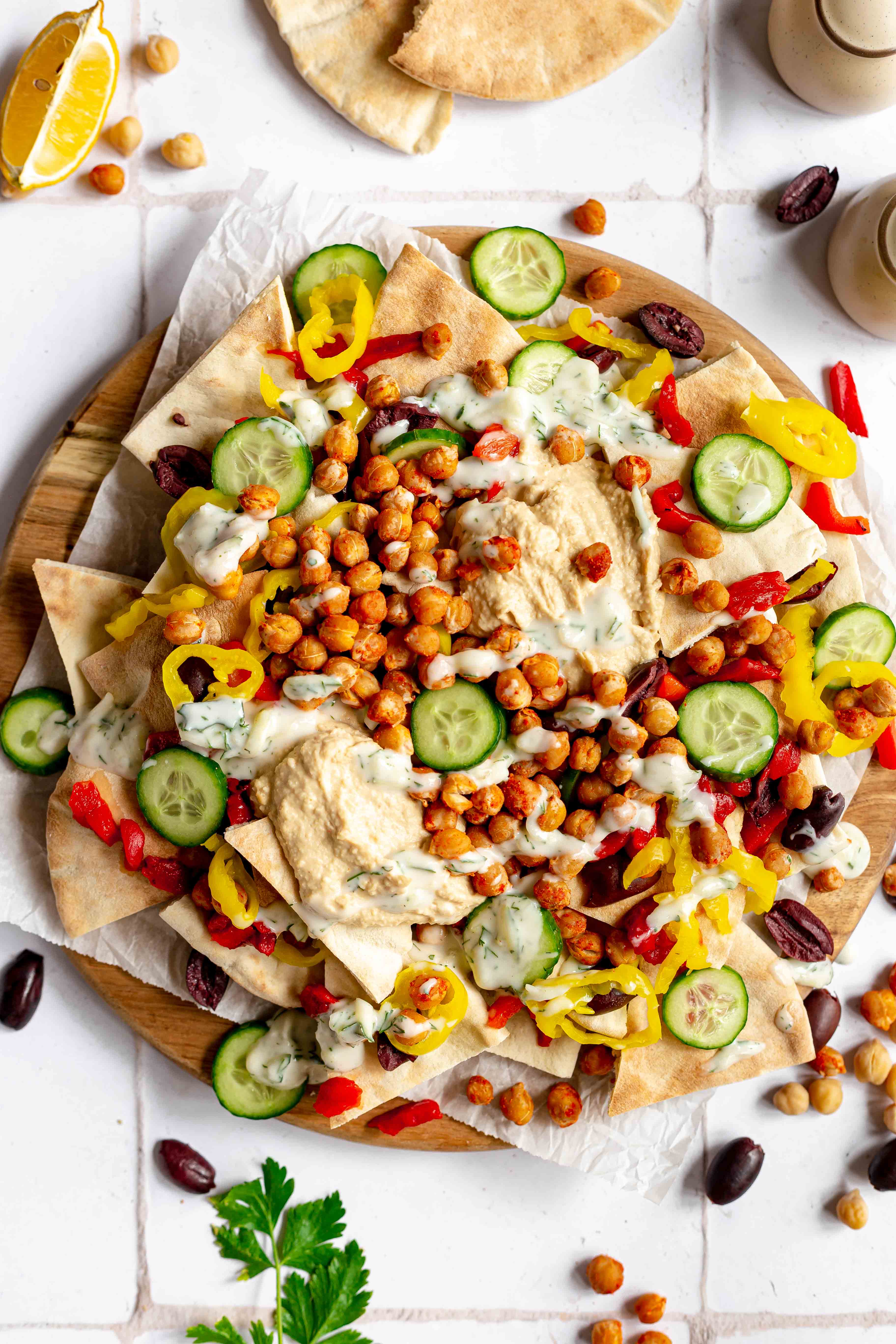 - To assemble, place a bed of pitas down on a baking sheet or tray. Dollop the hummus onto the pitas, add the chickpeas, top with the olives, red peppers, banana peppers, and cucumbers. Drizzle with tzatziki. Enjoy!