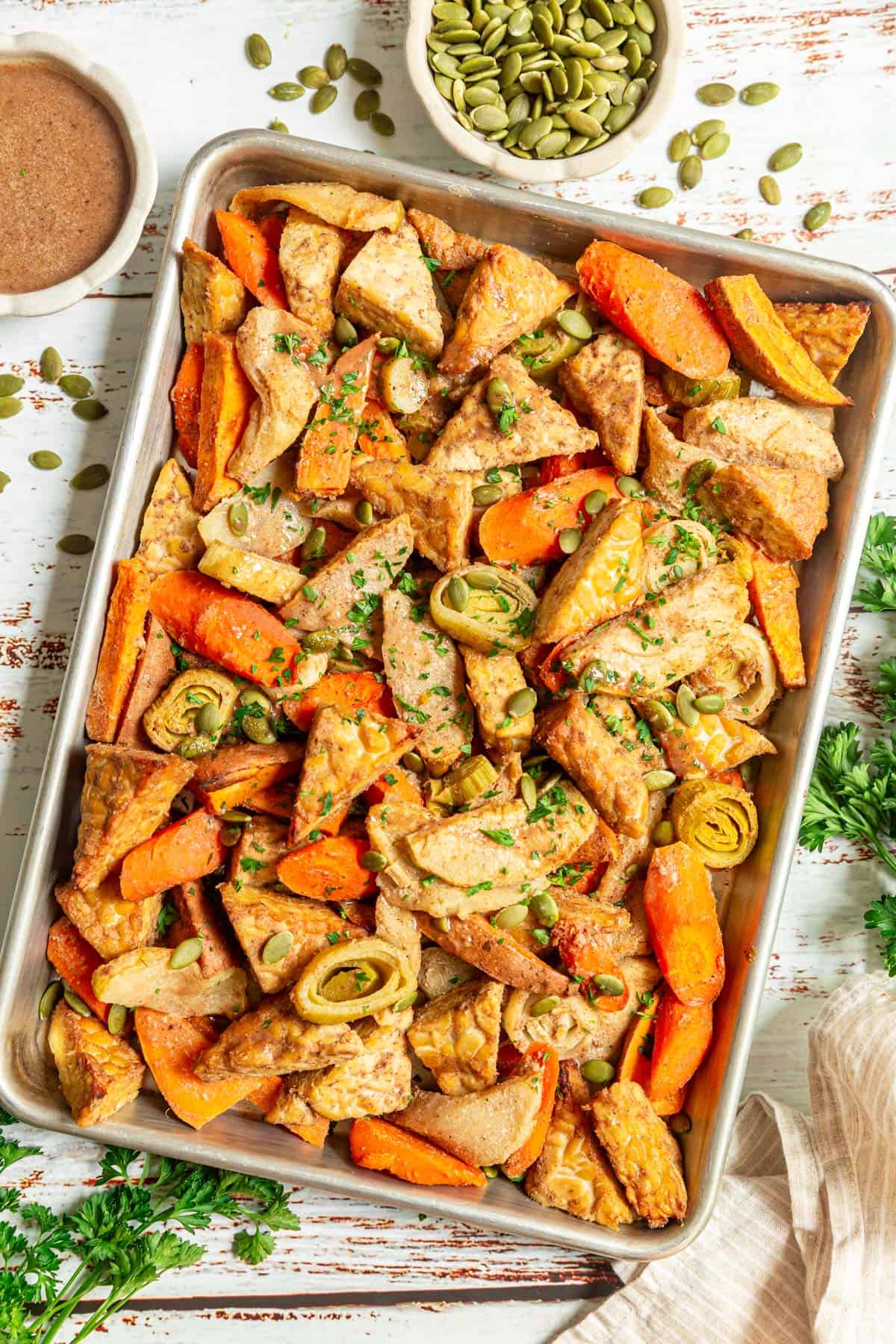 And with spices like cinnamon and nutmeg, this sheet pan tempeh dish is perfect for fall.