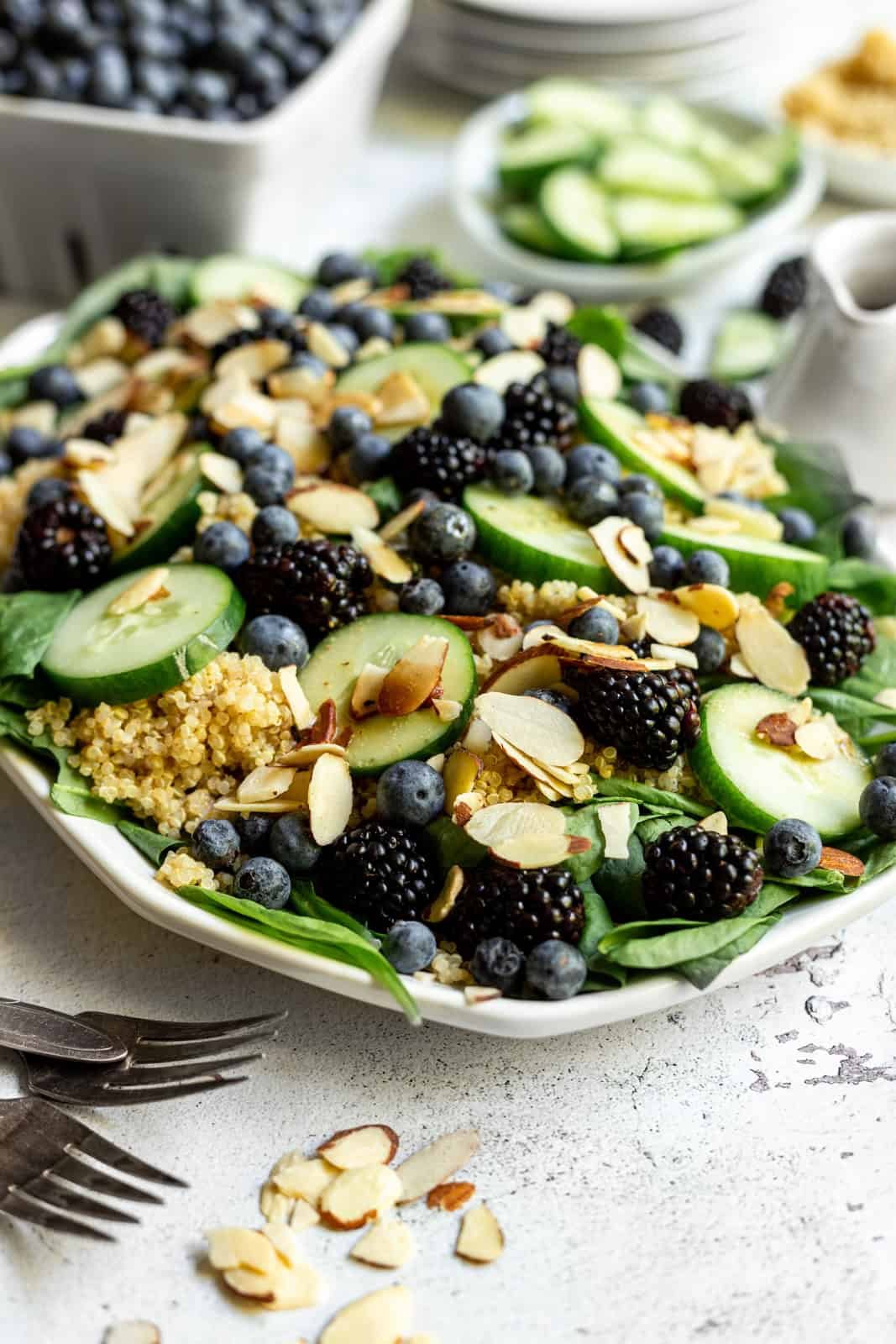 - Assemble the salads. Toss the spinach with the quinoa, cucumber, blueberries, blackberries, almonds and dressing. Enjoy!