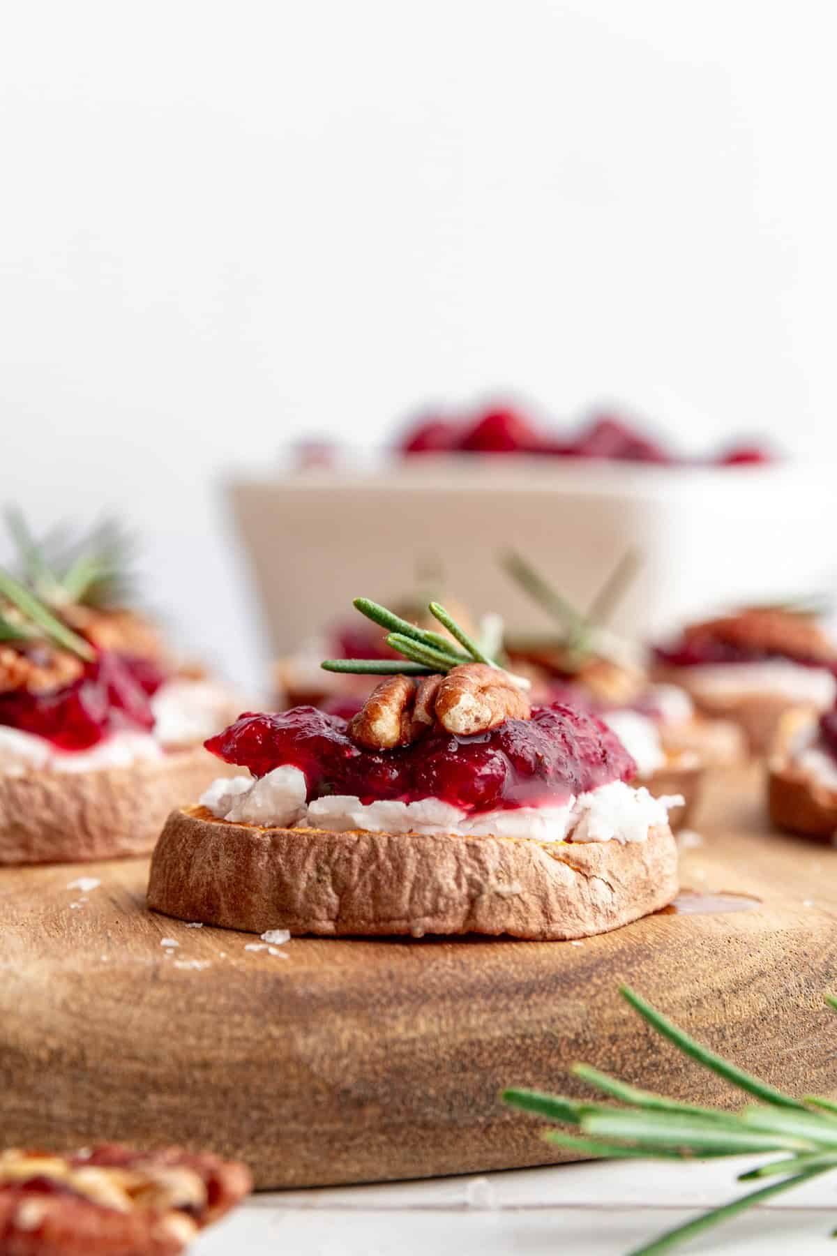 - Assemble the crostini. Spread two teaspoons of cream cheese onto each potato round. Add two teaspoons of cranberry sauce. Top with a pecan, then a sprig of rosemary. Sprinkle with sea salt and drizzle maple syrup.