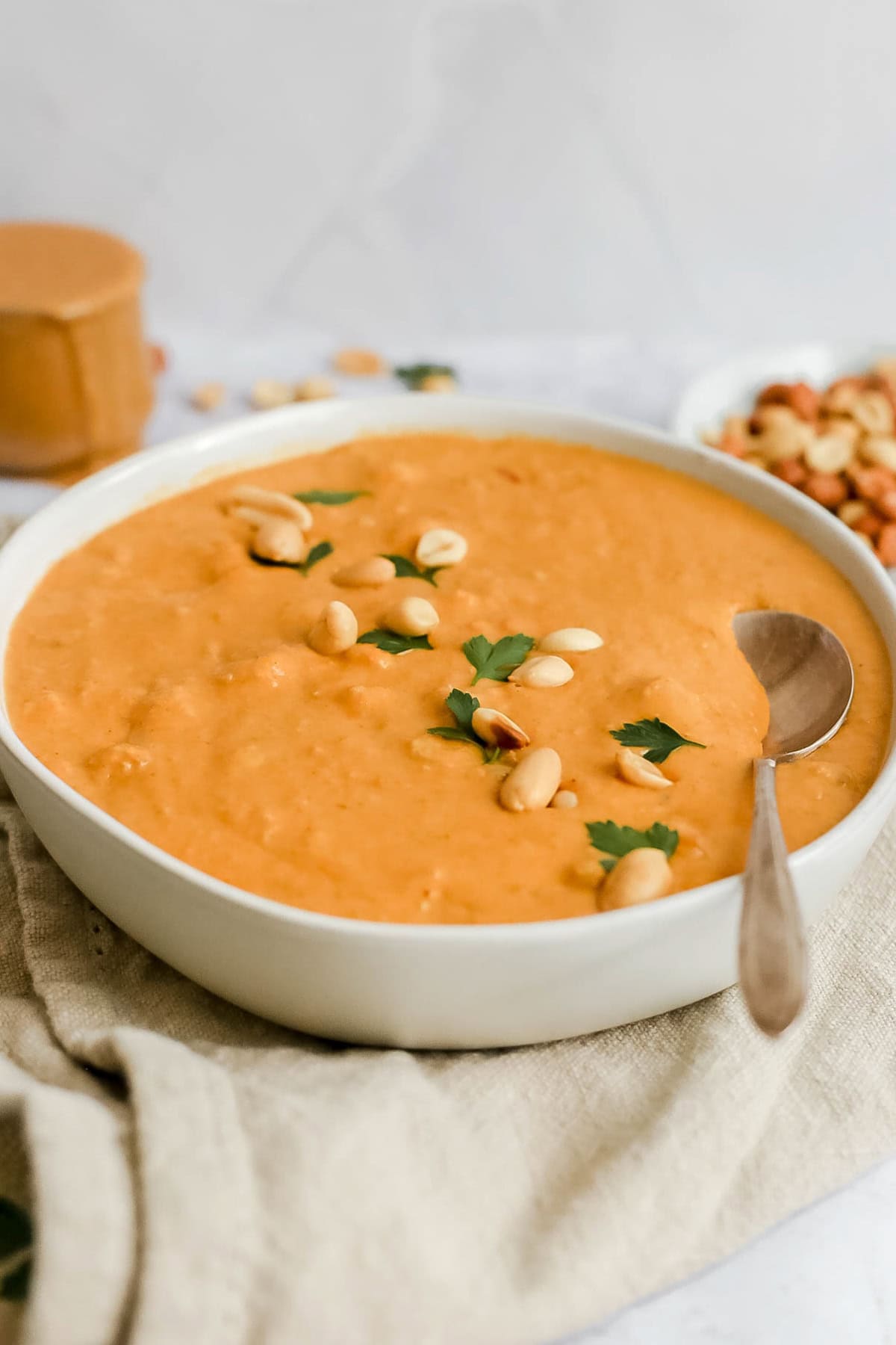 I recommend sprinkling some peanuts and parsley on top of this soup for extra crunch and a pop of green.