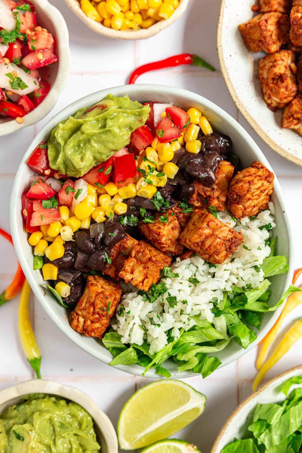 - Assemble the bowls. Line your bowl with rice, tempeh, beans, salsa, lettuce, corn, guacamole, and any other toppings you want.
