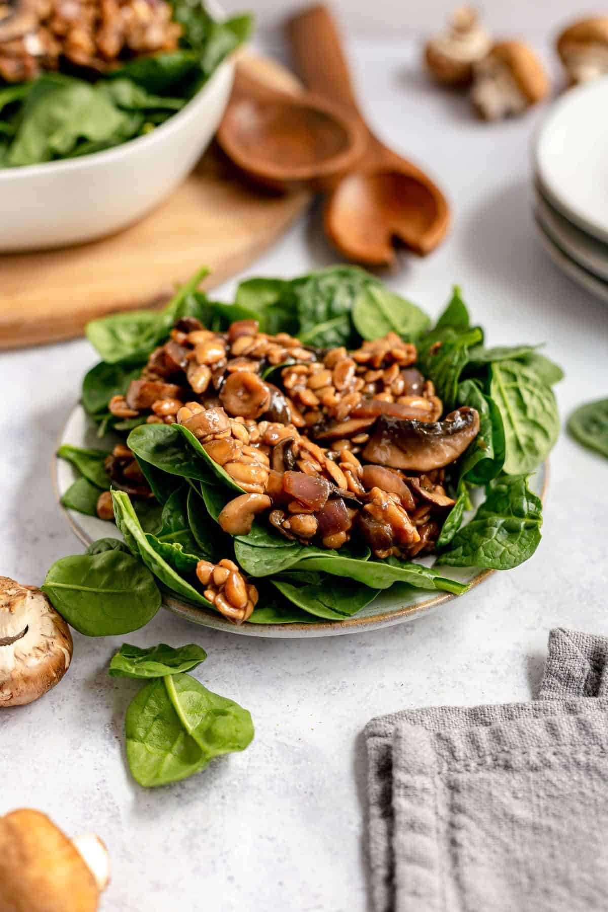 - High protein - tempeh is fermented soy beans, meaning it's packed with protein. Plus, there's a surprising amount of protein in both spinach and mushrooms. A serving of this salad has more than 20 grams of protein