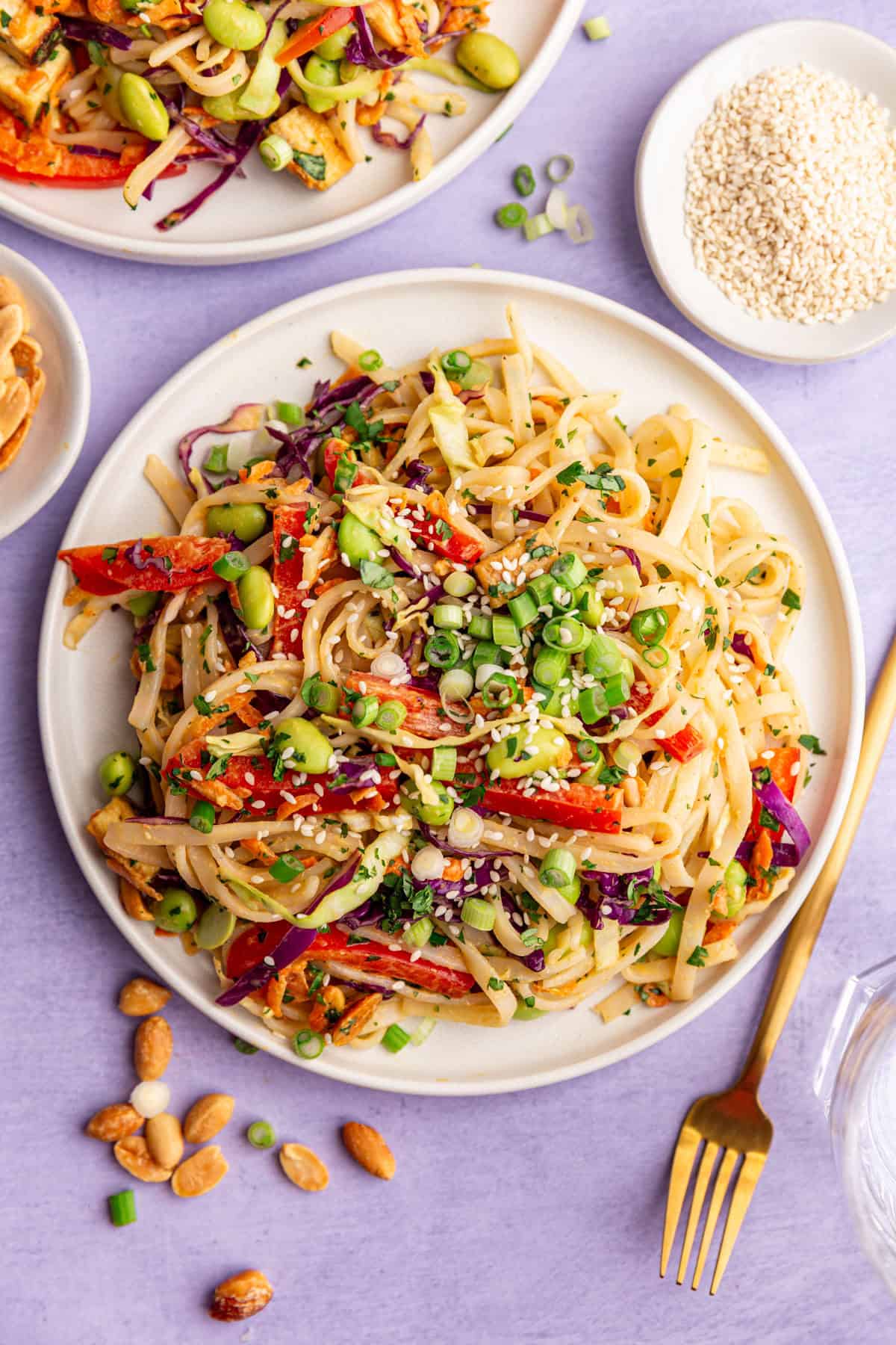 These Thai noodle bowls are a cross between pad Thai and my Thai peanut salad. They are loaded with colorful veggies, high in protein, and, of course, filled with noodles.