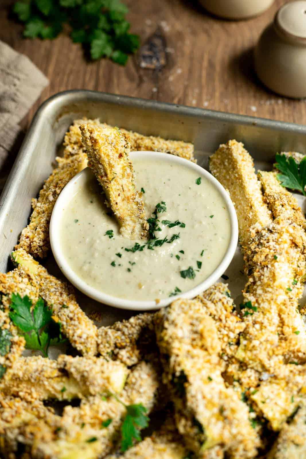 Vegan Air Fryer Zucchini Fries are your classic breaded fries made vegan and gluten-free. These tasty fries are crispy and delicious, yet still nutrient dense. Make 'em in your air fryer or oven.