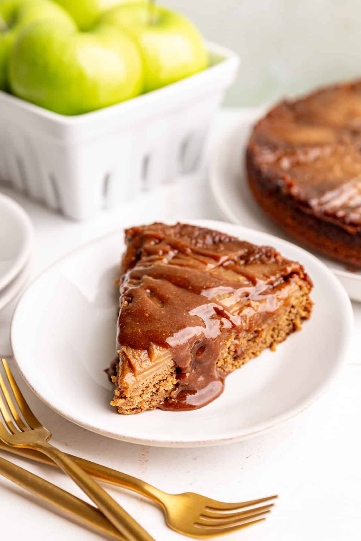 This Vegan Apple Upside Down Cake features caramel, apples, and moist gluten-free cake. Served upside down to reveal a beautiful design.