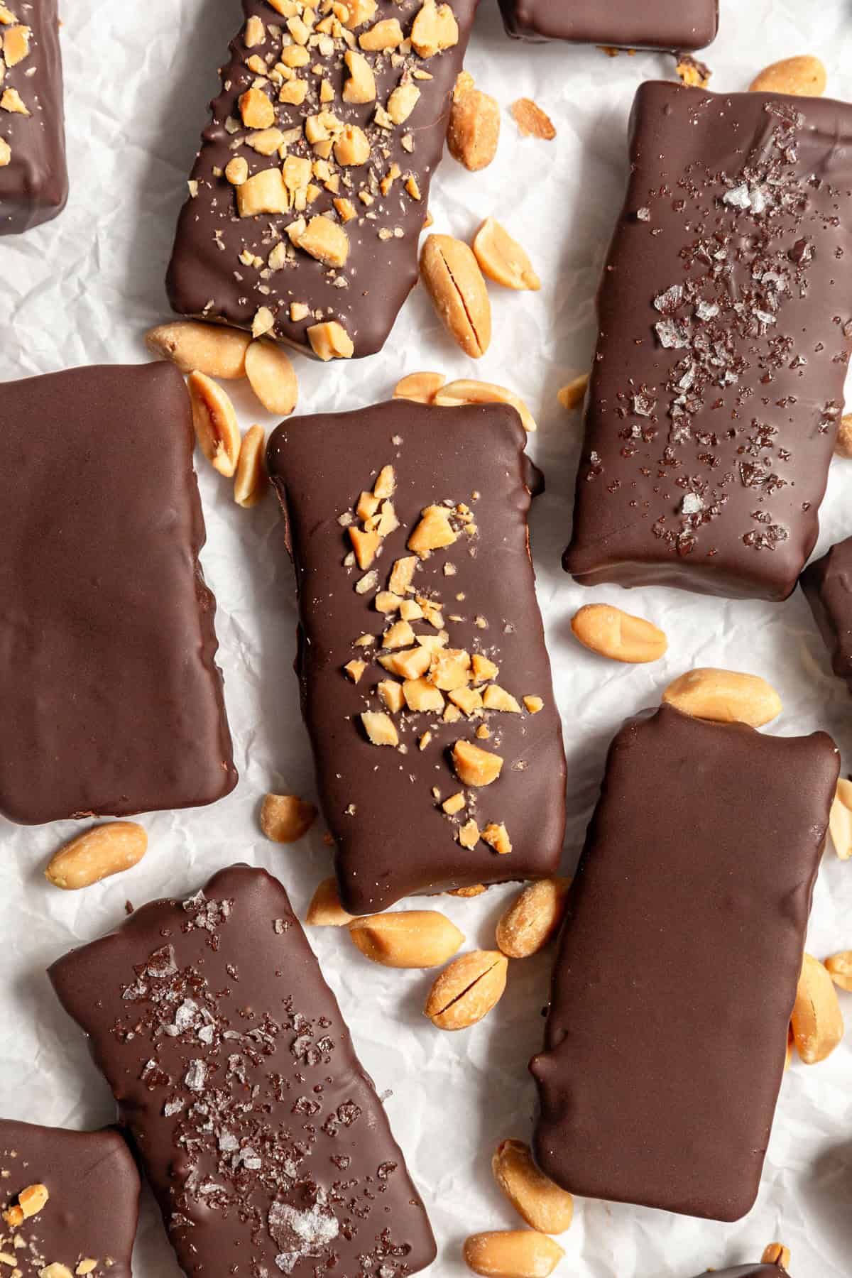 - Use a fork to coat each bar in chocolate. Place on a wire rack or parchment-lined baking sheet to drain. If desired, sprinkle with chopped peanuts and/or flaky sea salt. Let the bars set completely.