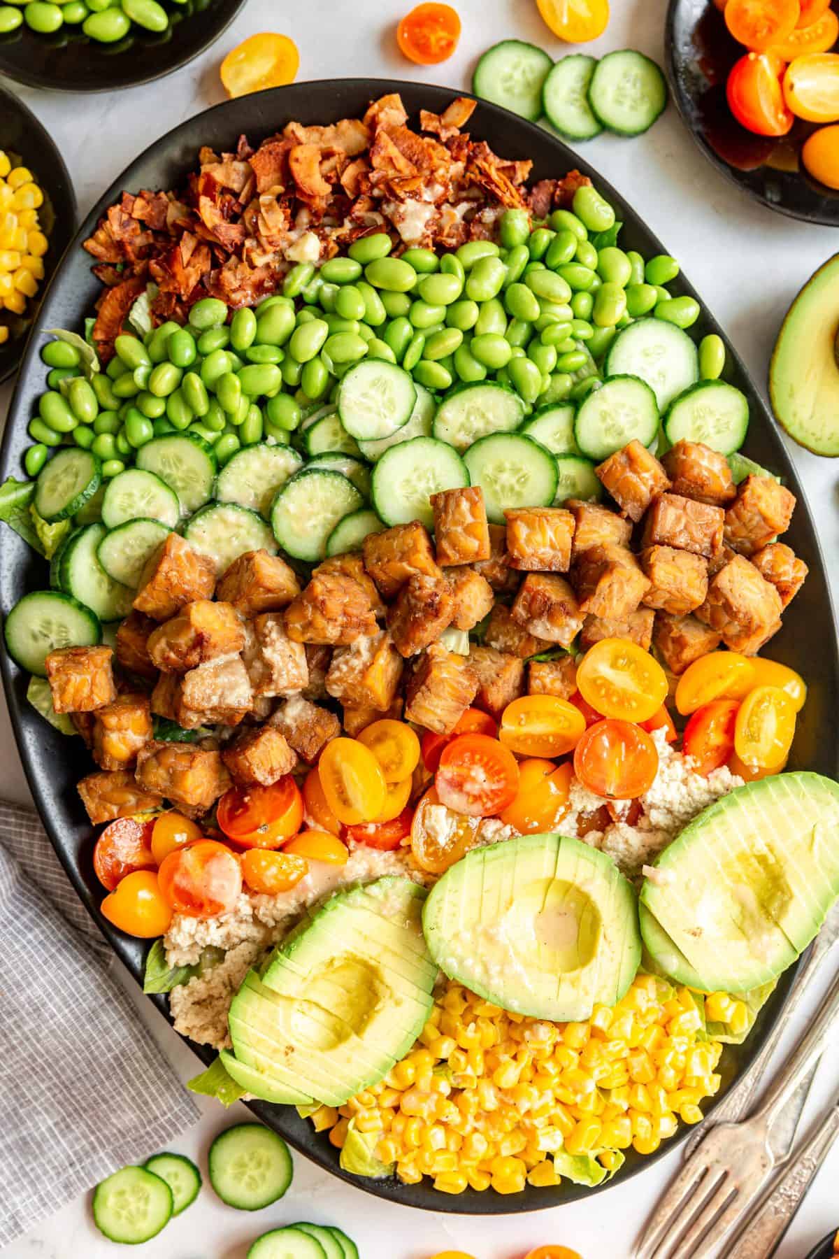 - Assemble the salad. Toss the lettuce with a few tablespoons of the dressing to coat, then arrange on a platter or serving bowl. Arrange the tempeh, coconut bacon, tofu cheese, avocados, tomatoes, corn, and cucumbers on top of the lettuce. Drizzle with the remaining dressing. Enjoy!
