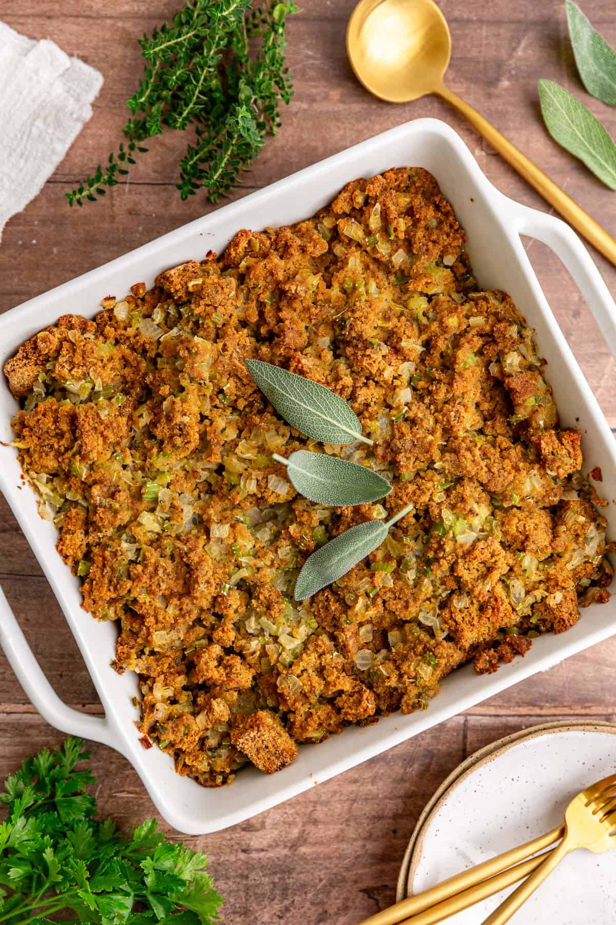Make vegan cornbread stuffing, an easy plant-based and gluten-free stuffing, made with homemade cornbread. Sweet and savory!