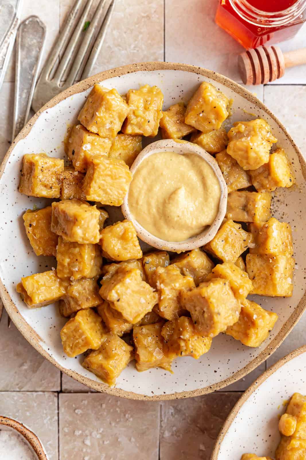 This tempeh has a vegan version of honey mustard with just a few ingredients like mustard (of course), maple syrup, and white wine vinegar.