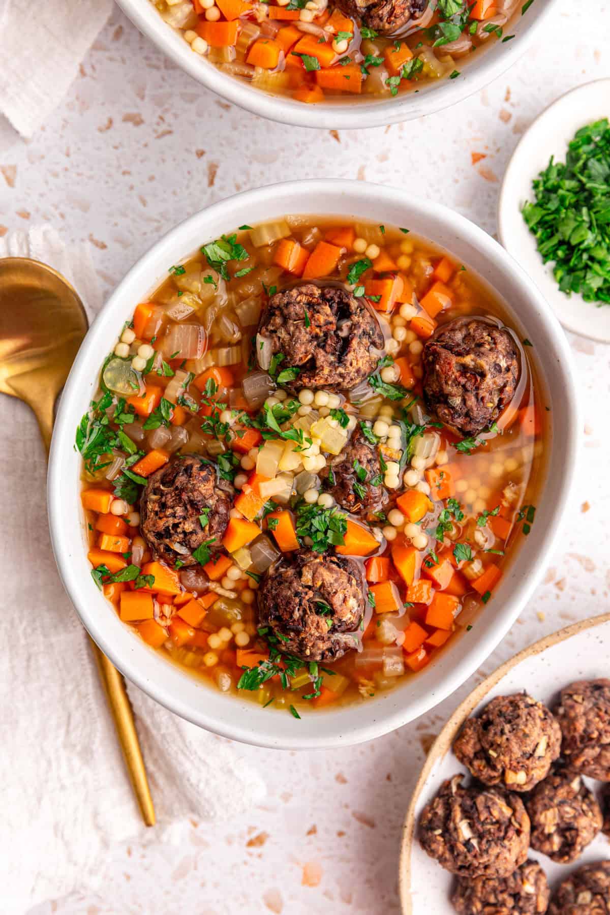 - Serve the soup. Add meatballs by the bowl and garnish with parsley. Only add meatballs to dish as needed for serving or they will get soggy - store meatballs separately.