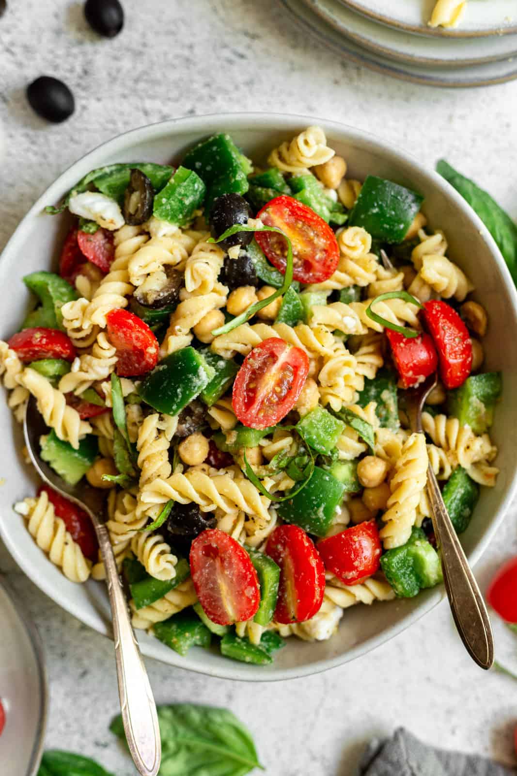 Vegan Pasta Salad is easy to make with just a few simple ingredients. With a homemade oil-free dressing to go with, this salad is completely plant based, and, of course, delicious!