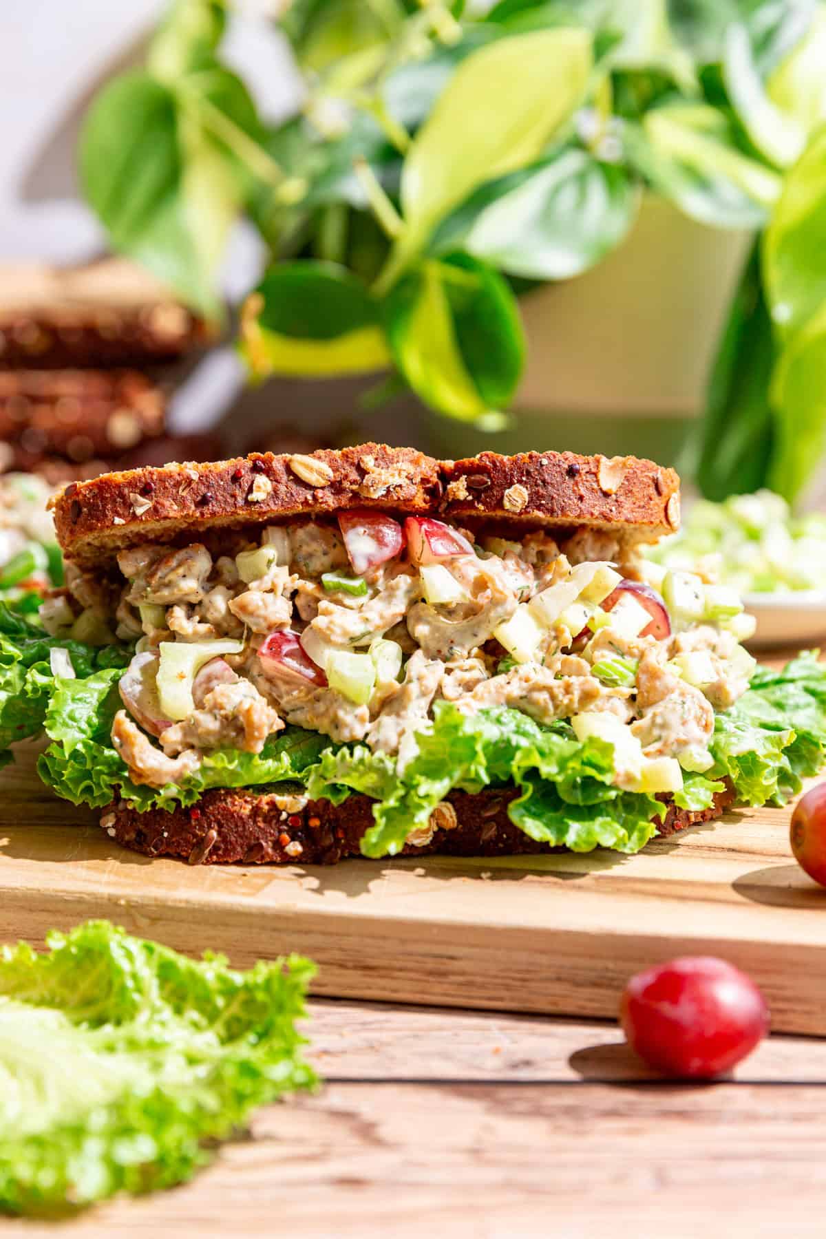 This Vegan Protein Chicken Salad is a hearty, flavorful vegan version of classic chicken salad. Absolutely packed with protein from shredded seitan chicken. It's easy to prep, and perfect for sandwiches or lettuce wraps.