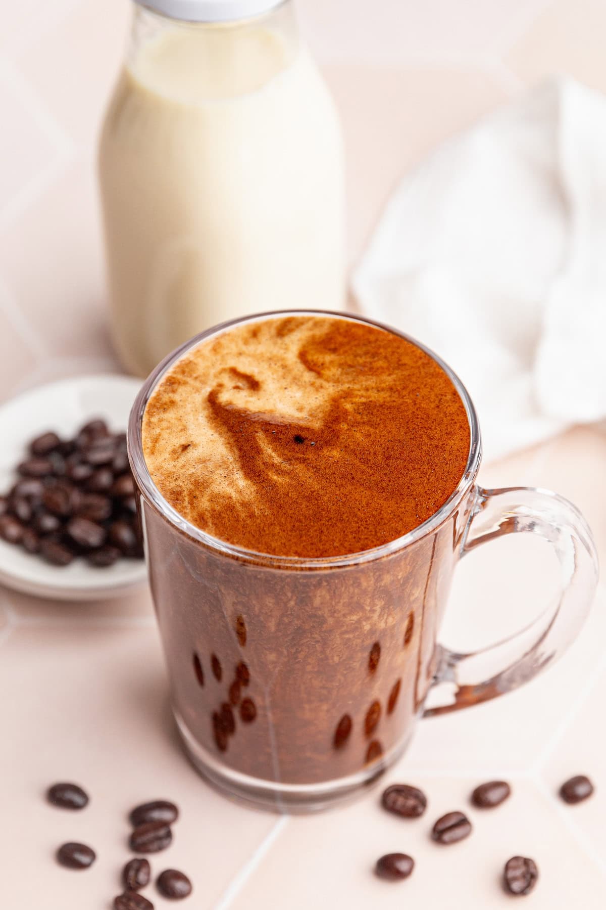 Homemade vegan protein coffee that actually tastes good! This 5-minute coffee is easy and delicious. Serve hot or iced.