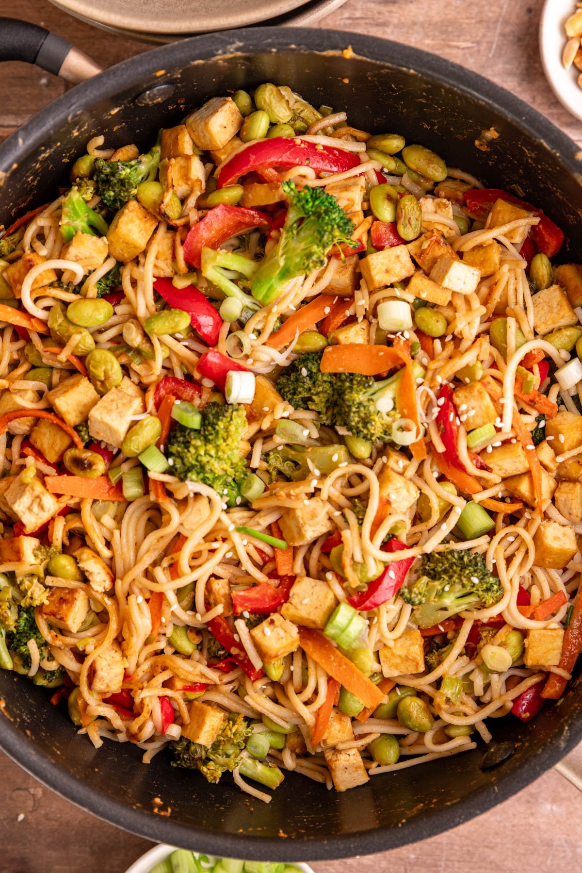 Along with the noodles and tofu, to make it a full meal, I added some veggies: broccoli, carrots, bell pepper, and edamame for even more protein. Feel free to use your favorite vegetables or whatever you have on hand. This recipe is perfect for frozen veggies and makes prep so easy.