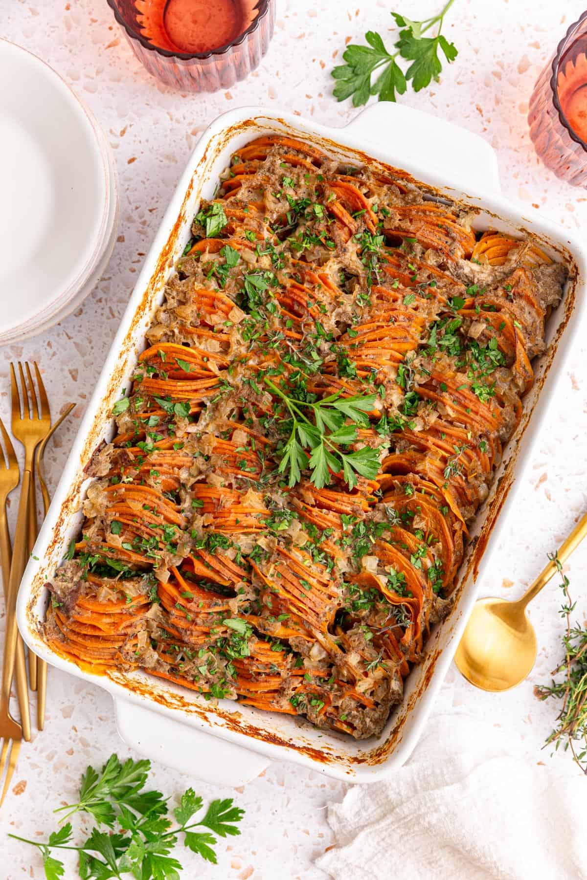 Classic potato gratin with a sweet potato twist. This Vegan Sweet Potato Gratin is simple, yet hearty and flavorful. Plant-based and dairy free!