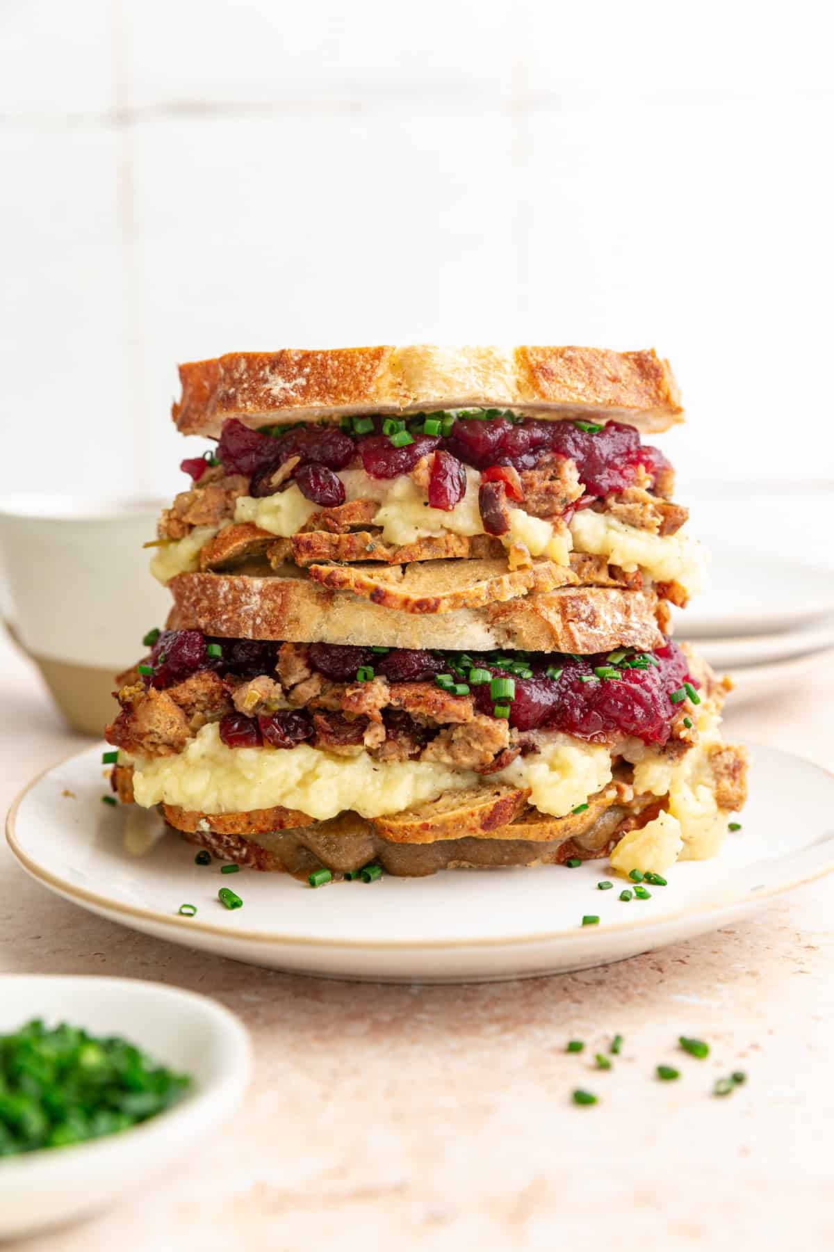 - Toast your bread if desired. Then, onto one piece of bread, spread a thin layer of gravy. Add your seitan turkey or other protein, then mashed potatoes and stuffing. Top with cranberry sauce and fresh chives. Add the remaining slice of bread.