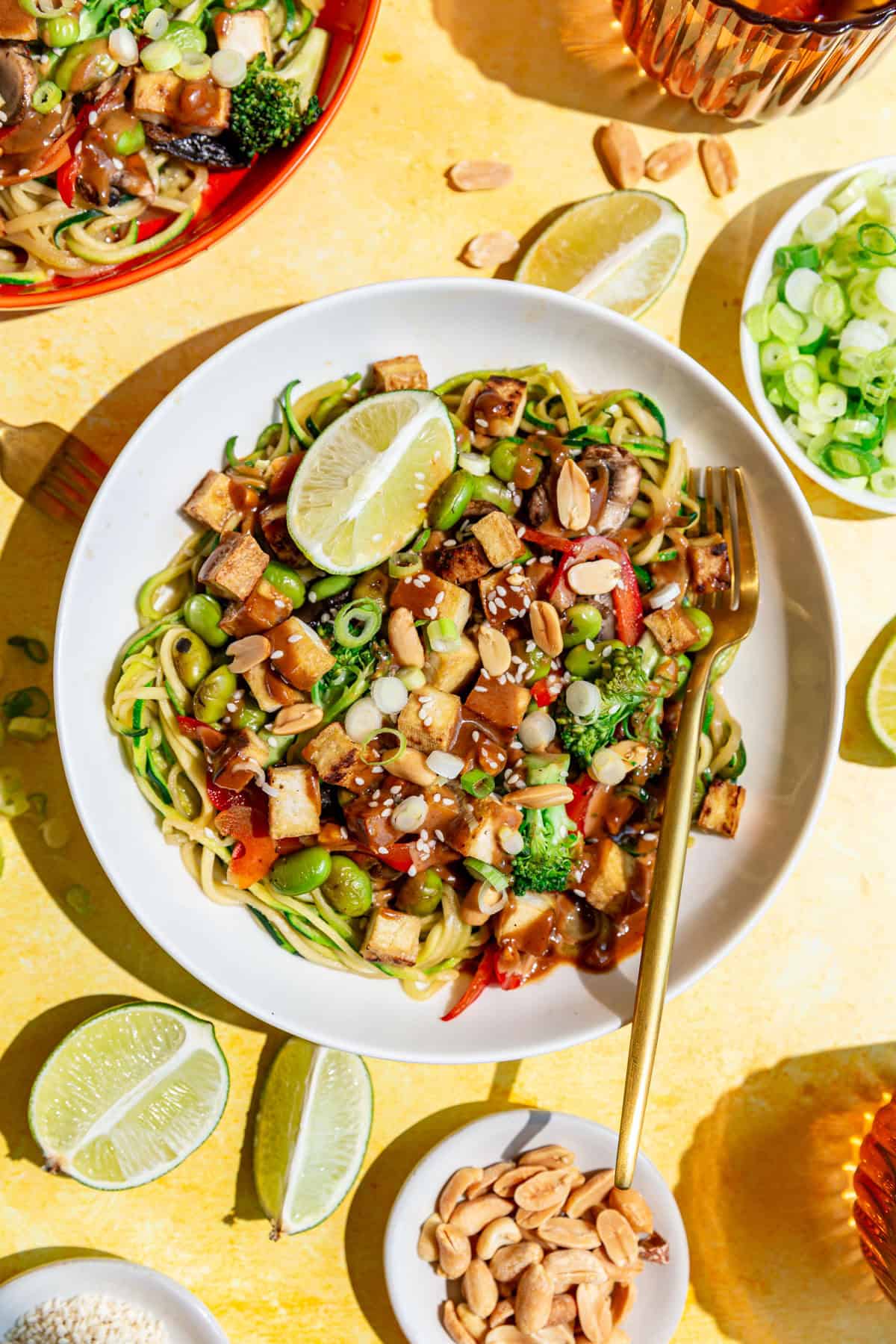 - Serve. Add the zoodles to a bowl and top with veggies, tofu, the remaining sauce, and toppings like lime juice, peanuts, scallions, and sesame seeds.